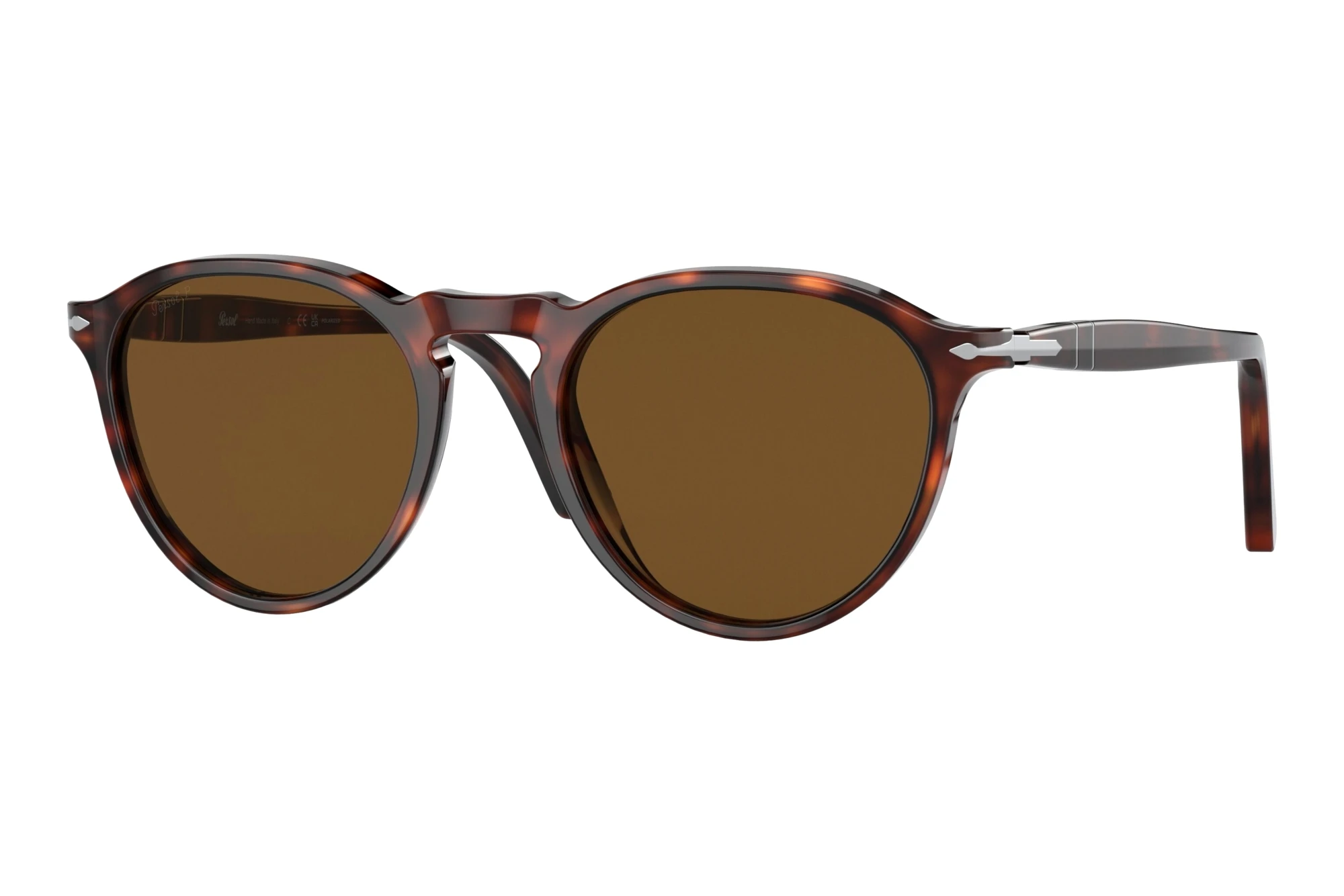 Denne model fra Persol er en all-rounder og passer både til kvinder og til mænd. Farven Havana beskriver en særligt varm, plettet brun farvetone, og er nærmestrepræsenteret i enhver kollektion. Stilen stammer helt tilbage fra brillens oprindelse, hvor stellet blev produceret af skjoldene fra skildpadder. Havana får dit ansigt til at synes blødere og er nemt at kombinere med farver fra efterårs- og forårskollektioner. Udover grå, er brune glas dem som forvrænger synsindtrykket mindst. Med alle andrefarver tager det længere tid for øjet, at neutralisere farveindtryk. Disse mærkevare solbriller tilbyder også Optimal UV400 beskyttelse til dine øjne. Hvad enten du er undervejs i trafikken eller på pisterne afhænger din egensikkerhed også ofte af dit udsyn. Gennem de polariserede glas i denne model bliver tilbagekastet lys fra reflekterende overflader, som vand, glas eller sne opløst. Således bliver det bedste udsyn sikret.
